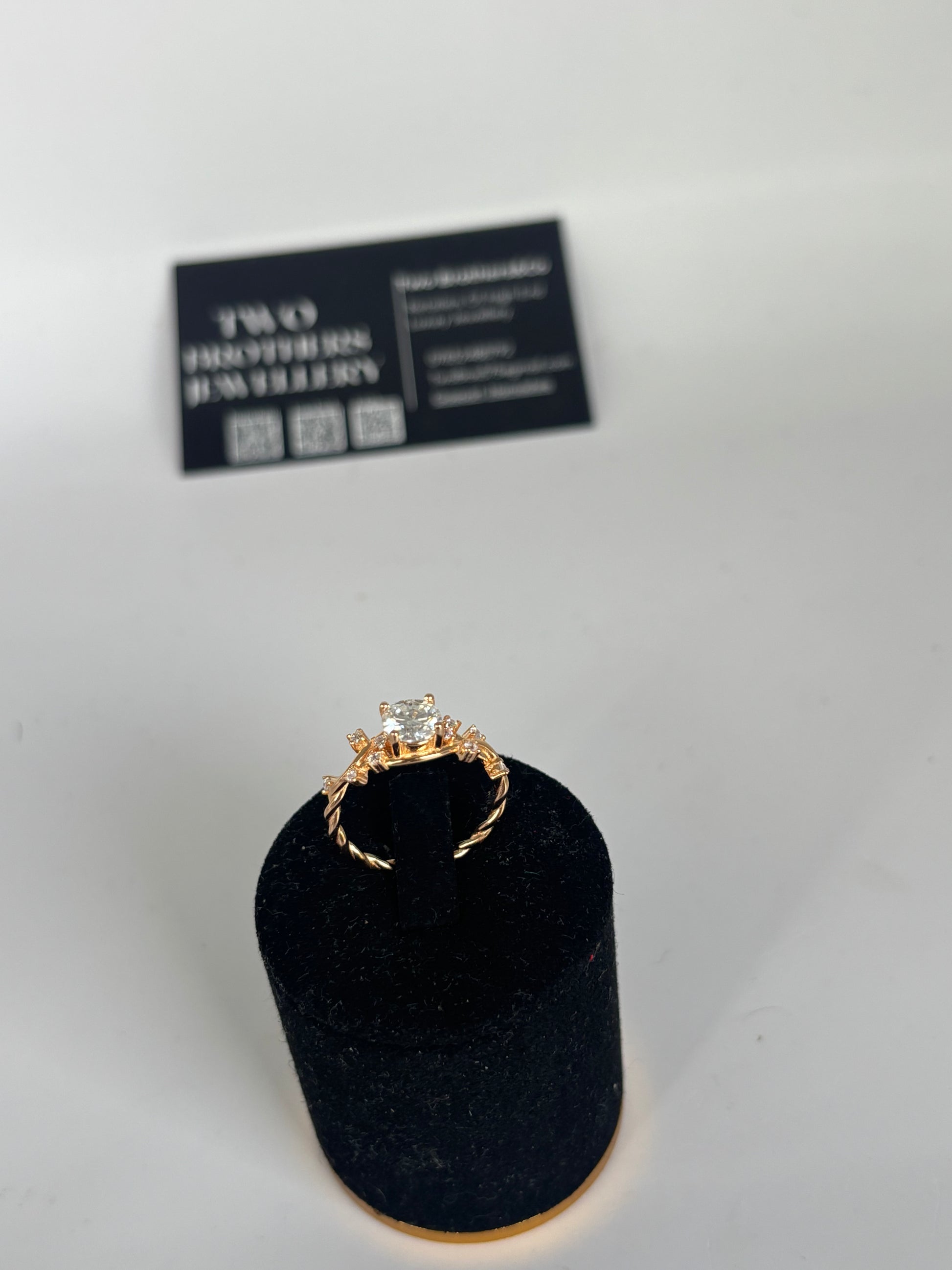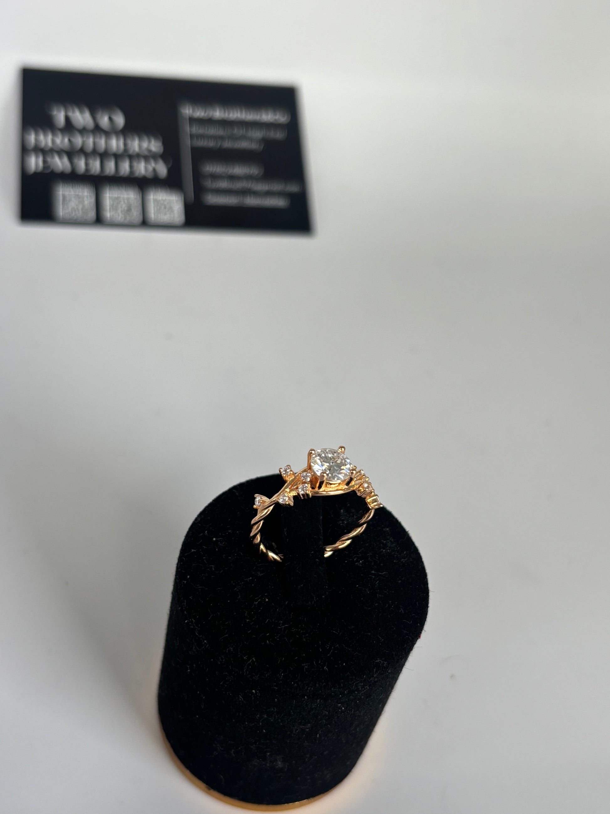 A stunning 1 carat moissanite centre stone set on a delicately twisted vine-style band, finished in rich 18k gold plating. This elegant piece features intricate side stones for added brilliance and luxury. Perfect for engagements, gifts, or everyday elegance.
